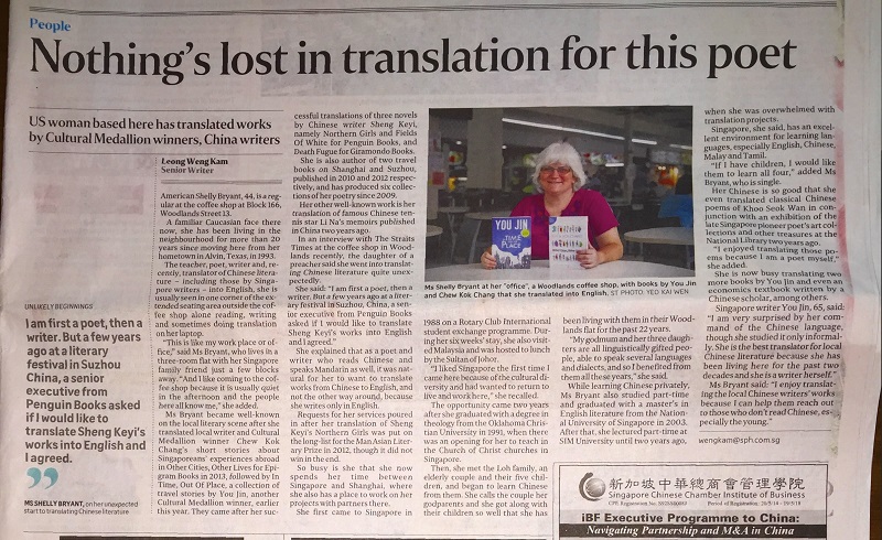 资深记者梁荣锦今天在海峡时报重点介绍了美国诗人兼翻译家白雪丽(Shelly Bryant)近乎神奇的真实故事。她于1991 旅居新加坡,自学华文,学得得心应手,迄今已经把多部华文作品翻译为英文;这些作品包括:虹影的《好儿女花》、周粲的《微型小说选》、李娜的《李娜自传》、范稳的《悲悯大地》、盛可以的《北妹》、《死亡赋格》和《 白草地》。
