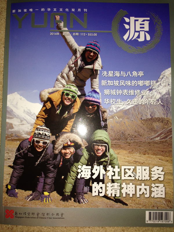 主编谭瑞荣在“编辑语”的开首两段中,语重心长地写道:“山是我喜欢思考的对象。我常常用文字和绘画去表达对山的理解和感悟。因为山不仅象征着坚毅、顽强的性格,还蕴含着人类不断探求的某种精神和物质能量,浩瀚而深邃。正巧,在编辑这期杂志时,看到一张照片:六位南洋初级学院的同学,用身体“搭”成了一座山的造形。青春的躯体,灿烂的笑容,表达出了对山的崇敬、向往以及战胜高山的喜悦和豪情。《海外市区服务的精神内涵》不就是让莘莘学子开阔眼界、换位思考、承受压力、培养战胜困难的勇气和力量吗?该专辑不仅用文字、也通过图片将其理念清晰地表达出来,且出自学生记者之手,的确可喜可贺。”
